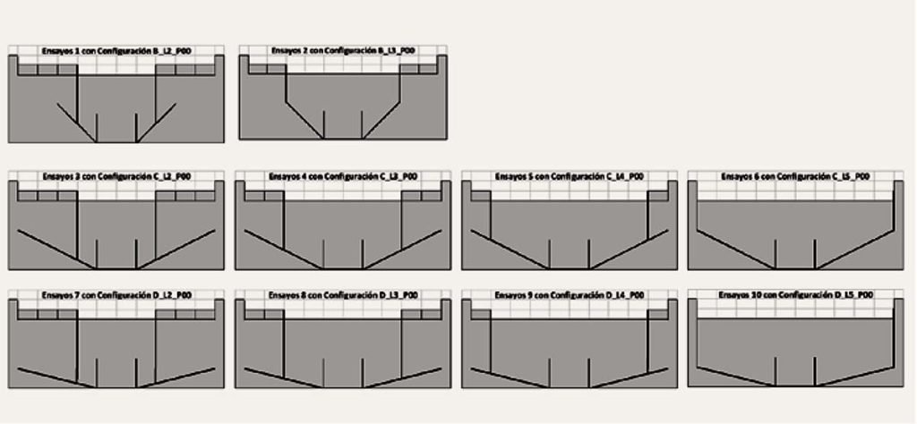 Se realizaron varias campañas con un total de 649 ensayos en los que se combinaron los diferentes parámetros geométricos, tales como las diferentes longitudes de vertido, el porcentaje de reparto entre los vertidos de las zonas centrales y laterales, y distintos ángulos en los cajeros laterales de recogida de varios caudales (véase infografía de abajo).