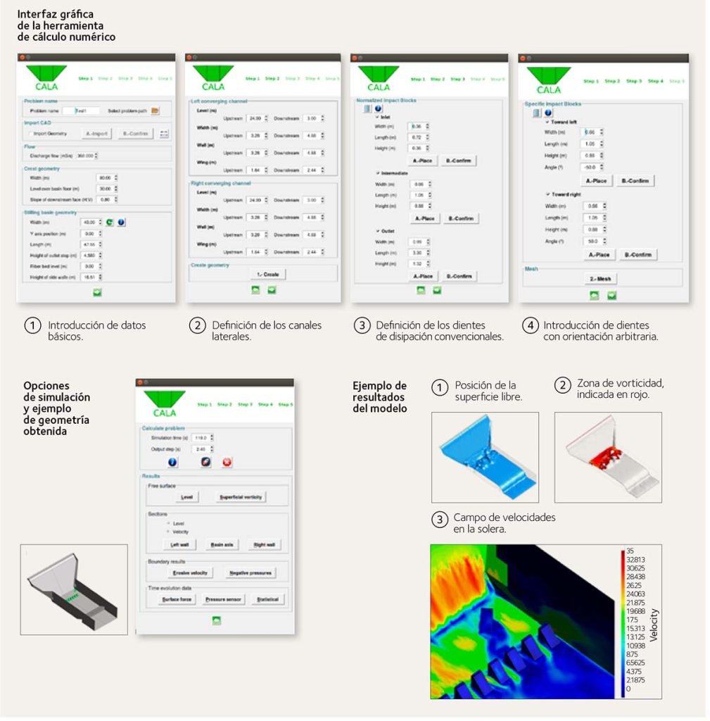 Finalmente se han integrado una serie de utilidades para la visualización de los resultados más relevantes para el diseño de aliviaderos (infografía de la derecha), como pueden ser los rebases, la superficie libre, la detección de velocidades erosivas a la salida del cuenco, las zonas de presiones negativas (cavitación), o la determinación de fuerzas dinámicas en dientes de impacto y cajeros laterales, entre otros.