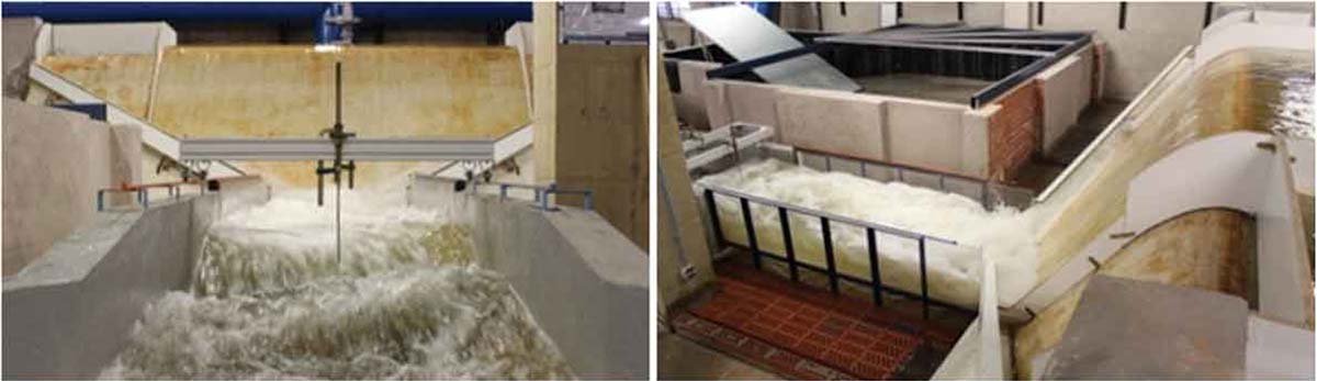 La fase de ensayos (véanse imágenes de la izquierda) permitió definir un criterio objetivo sobre la disipación de energía aplicable a los cuencos de aliviaderos con cuenco amortiguador paralelo al canal de aliviadero; de este modo se consiguió tener una idea sobre la disipación que se logra con este tipo de aliviaderos en cuencos diseñados para formación de resalto hidráulico ya que se obtuvieron datos con los que calibrar el modelo y validar a posteriori la herramienta empleada en el cálculo numérico.