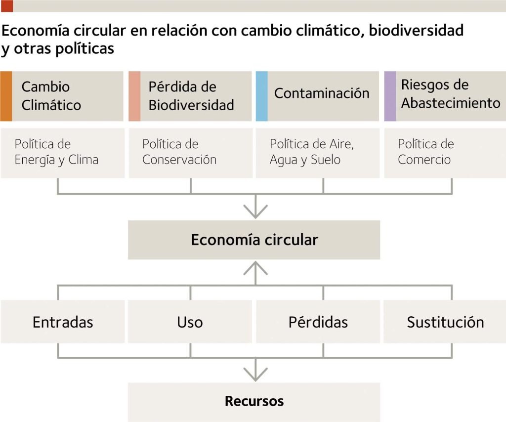 Estas cuatro categorías caracterizan la EC y son, de hecho, una representación simplificada de los esquemas más completos de las denominadas estrategias R (1). Al aplicar estas estrategias al uso de los recursos, una EC puede, por ejemplo, contribuir a combatir el cambio climático y la contaminación ambiental y a reducir la pérdida de biodiversidad y los riesgos de suministro de materias primas.