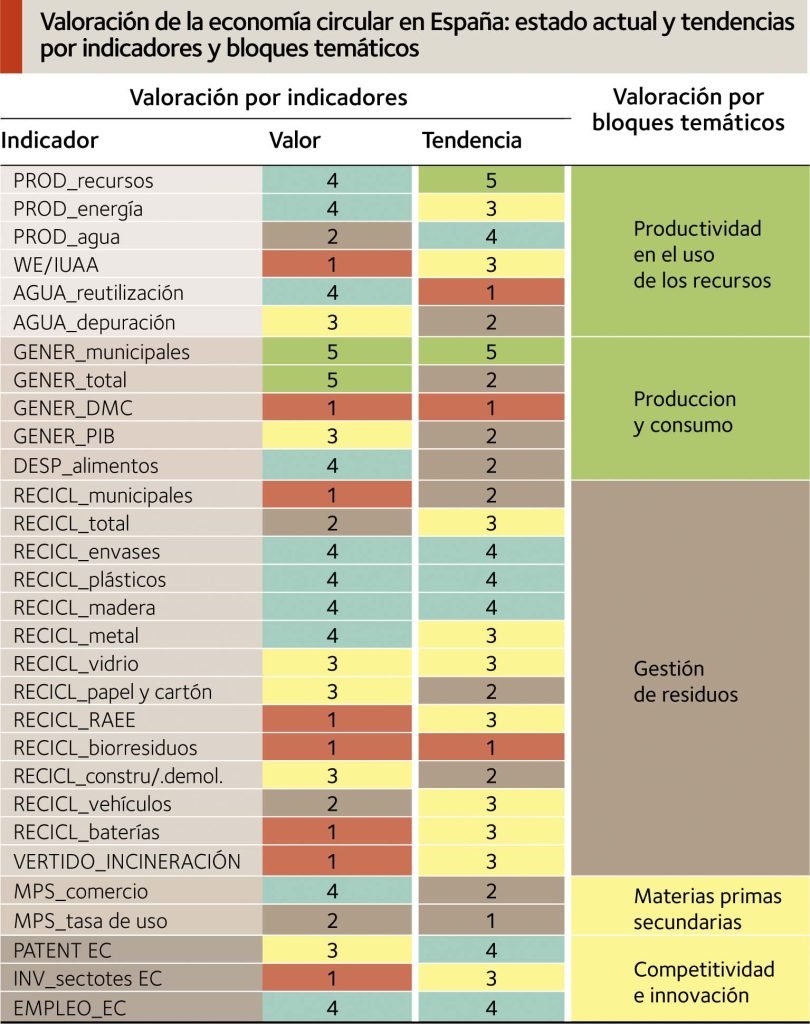 Cerrando el circulo es el título de un informe del Observatorio de la Sostenibilidad (2) cuyo objetivo es conocer la situación de España en el conjunto de la UE en aquellos temas que pueden caracterizar la EC a través de los principales indicadores procedentes de fuentes oficiales europeas y españolas. Es una labor que aporta una visión de conjunto y comparativa de nuestra situación, destacando nuestras fortalezas y debilidades a través de los 16 indicadores cuantitativos seleccionados por la Comisión Europea (publicados en EUROSTAT) para evaluar la EC, a los cuales se les añaden otros procedentes de otras secciones de EUROSTAT y de las fuentes oficiales españolas hasta alcanzar un número de 30 indicadores, que son tratados de manera cualitativa, estableciéndose 5 niveles de cumplimiento y 5 tipos de tendencia en cada indicador y en cada bloque temático para España.
