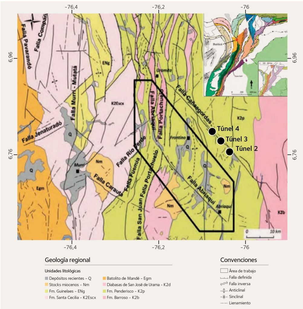 El complejo ambiente tectónico del área de los túneles, representado en parte por el lineamiento de la falla Cañasgordas, se traduce en deformaciones frágiles y dúctiles de los diferentes tipos de rocas, principalmente de las rocas sedimentarias. La deformación frágil reportada en los levantamientos geológicos de los Túneles 3 y 4 es derivada entonces de las fases finales de acreción continental y viene definida por lineamientos y sistemas de fallas sinextrales de orientación NW y componentes inversos, y por fallas inversas de orientación NS. Entre las primeras se incluyen las fallas Abriaquí y Cañasgordas y fallas menores, como las de Portachuelo y Morrogacho en la zona occidental y las fallas de Arma y La Mansa en el extremo oriental. Las estructuras de orientación NS, por su parte, vienen representadas por los sistemas de fallas de Cauca-Romeral, Herradura-San Ruperto, Portachuelo, Dabeiba-Pueblo Rico, Murrí-Mutatá y Murindó, que generalmente exhiben un comportamiento predominantemente inverso con componente lateral izquierdo (Noriega-Londoño y Caballero-Acosta, 2015). Estas fallas son consideradas posibles fuentes de eventos sísmicos en el área y, de acuerdo con la red sismológica nacional-RSNC, alcanzan magnitudes Ml que varían en el rango de 1.5 a 5.1. Wells y Coppersmith (1994) indican que eventos de magnitud 6 en la escala de Richter solo podrían asociarse a una falla de una longitud de más de 10 kilómetros, como la de la falla Cañasgordas y Abriaquí.