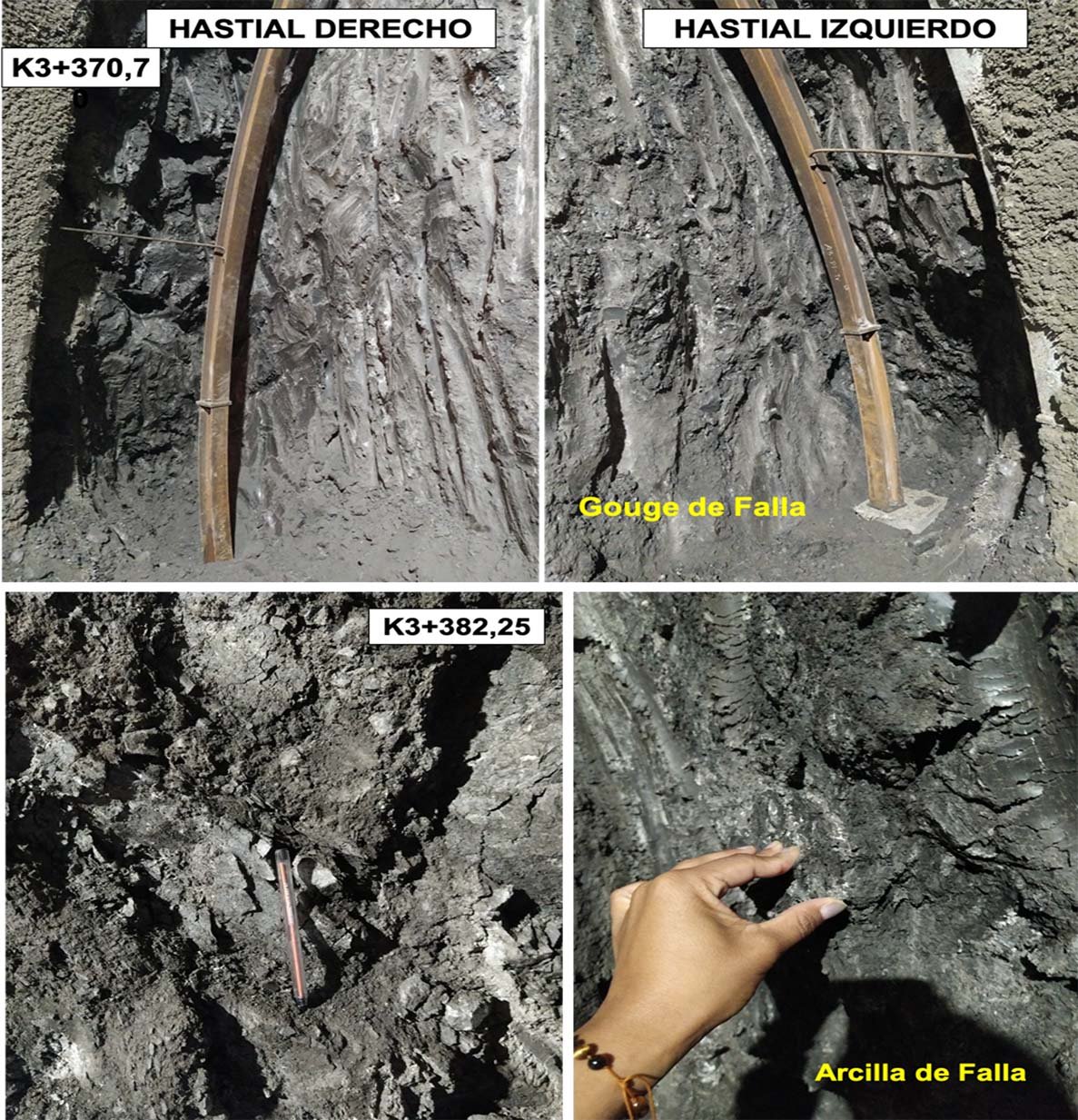 En el Túnel 3 las evidencias tectónicas de la falla Cañasgordas se observan en zonas de deformación dúctil que están en contacto con zonas de deformación frágil, así como en zonas intensamente diaclasadas que generaron comportamientos geotécnicos totalmente diferentes en los hastiales de un mismo frente de excavación (véase figura 3).