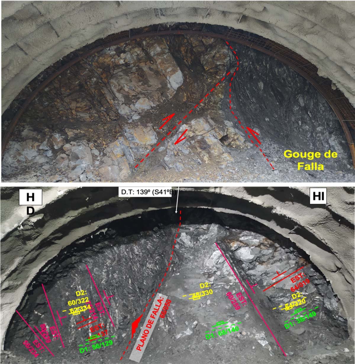 Las evidencias de la afectación dinámica que ha ejercido la falla Cañasgordas en la geología de los túneles es la presencia de rocas de falla, como arcillas, gouge y brechas de falla. En el Túnel 2 estos tipos de roca de falla requirieron una reclasificación geotécnica y geomecánica del macizo rocoso debido a las deformaciones y procesos de asentamiento que presentó el macizo rocoso (véase figura 2).