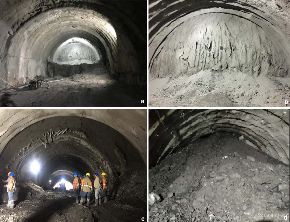 Figura 5. a) Deformaciones excesivas de la sección inicialmente circular hacia los hastiales; aparenta paredes rectas; b) Extrusión del frente de excavación generando abombamiento; c) Squeezing severo y dislocaciones del túnel (obsérvense deformaciones entre 1 m y 2 m; d) Pérdidas frecuentes de los frentes de excavación.