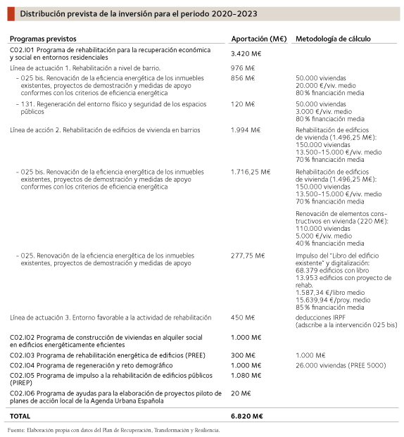 El Plan de Recuperación, Transformación y Resiliencia, España Puede, (69.528 M€), reconoce, en su redacción y asignación de fondos, el potencial del sector de la construcción como generador de empleo (pues, como ya se ha mostrado, recuperó en forma de “V” cifras de primeros de 2020), así como motor económico. El 29 % del plan lo aglutinan el programa de mayor cuantía económica vinculado a la movilidad sostenible (13.203 M€) y el programa de rehabilitación de vivienda y regeneración urbana (6.820 M€).