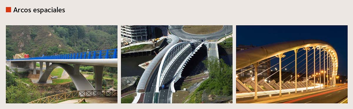 Pero quizá lo que resulte incluso más interesante son las formalizaciones que siguen de las combinaciones de dos o más de estos conceptos en el mismo puente o pasarela. Por ejemplo, al combinar la curvatura con el arco se obtiene el arco de planta curva de Endarlatza (2008), que necesita de una elevada rigidez transversal en el arco, o el puente sobre el rio Galindo (veánse fotografias de arriba), del mismo año, con un arco superior de planta curva, donde las fuerzas de desvío hacia el exterior del arco espacial se recogen por un atirantamiento de contrarresto anclado en el borde interior del tablero.