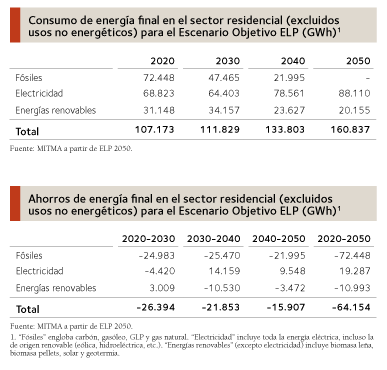 En las figuras adjuntas se resumen los objetivos de consumo de energía final en el sector residencial —para todos los usos: calefacción, ACS, iluminación, cocinas, etc.—, de acuerdo con la ELP 2050.