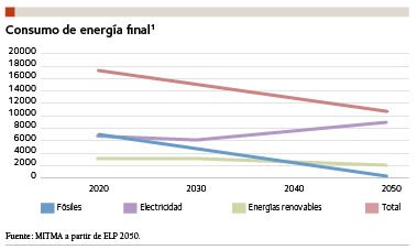 En cuanto a las energías renovables, la propuesta es tender hacia una electrificación del sistema, fundamentalmente basada además en energías renovables, que representarán el 97 % del consumo final. En el sector de la edificación, el objetivo básico en 2050 es avanzar hacia la electrificación en paralelo a la eliminación de los combustibles fósiles, en particular del gas natural, que en la actualidad es uno de los vectores más importantes.