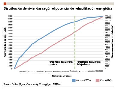 En la siguiente figura se representa en el eje de abscisas el número acumulado de viviendas a rehabilitar y en el eje de coordenadas, con dos escalas, el coste total acumulado de su rehabilitación (en GWh) y los ahorros que podrían obtenerse (en millones de €). Antes de su representación, se han ordenado todas las viviendas por eficacia, de manera que hacia la izquierda se representan las más rentables (viviendas unifamiliares, más grandes, y en zonas más frías) y hacia la derecha las menos (viviendas colectivas, más pequeñas, en zonas más cálidas). Como se observa, dada la muy diferente rentabilidad de las intervenciones (expresada como cociente entre la inversión necesaria para costear las obras según los menús correspondientes y los ahorros energéticos que se obtendrían), a partir de un determinado momento no resultaría rentable rehabilitar más viviendas, pues seguirían subiendo los costes totales (cuya función es más o menos una recta, es decir: son proporcionales al número de viviendas rehabilitadas), mientras que los ahorros acumulados ya no crecerían de forma significativa (al tener su función la forma de una curva que tiende a ser horizontal hacia la derecha).