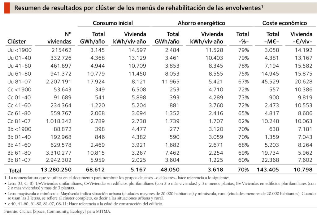 Teniendo en cuenta la ubicación y zona climática de cada vivienda, la definición constructiva del estado inicial y rehabilitado de la envolvente de cada caso y una serie de asunciones y datos de entrada (temperaturas de consigna, cargas internas por ocupación, iluminación y electrodomésticos, flujo de aire por ventilación, radiación solar), se realiza una modelización y doble simulación energética para todo el parque edificado, en los escenarios actual y futuro postintervención. Se calculan también los costes económicos de los menús de rehabilitación de la envolvente y los ahorros en energía y emisiones obtenidos, a partir de los cuales (mediante una serie de hipótesis sobre financiación, en las que se combinan subvenciones, préstamos, la capitalización de los ahorros energéticos, etc.) se puede determinar el momento en que estas propuestas de rehabilitación de la envolvente serían viables para los propietarios. En la tabla adjunta se presenta el resumen de resultados por clústeres.