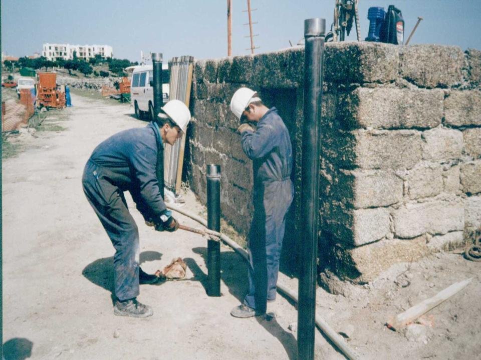 Para solucionar la problemática planteada, se realizó una nueva campaña de inyecciones, con especial incidencia en el extradós de los tres muros del bocín en contacto con el espaldón de tierras. En esta zona se realizaron 44 taladros —con una profundidad media en torno a 22 m—, que se entubaban en sus primeros metros y luego se inyectaban a baja presión y reperforaban en diversas fases hasta que el taladro se mantenía totalmente estable, momento en el que se procedía a realizar la última fase de inyección, aumentando la presión, y armando finalmente el taladro (véanse imágenes de arriba).