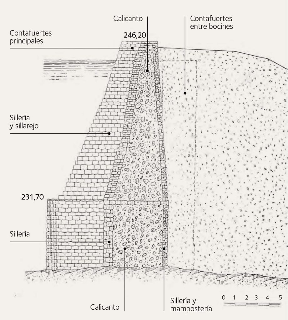 - Realización en el espaldón de tres «catas museo», que permiten apreciar la estructura interna de la presa, incluidos algunos contrafuertes de aguas abajo.