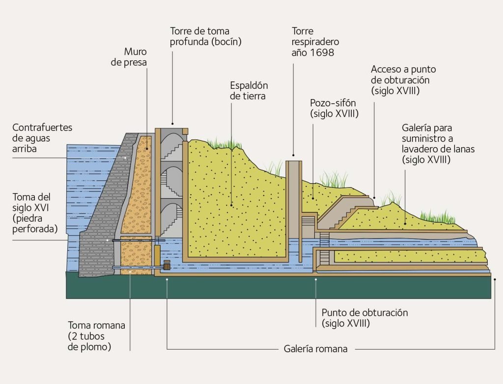 Esta actuación en la galería permitió conocer el sistema hidráulico asociado a la misma, que tiene una cierta complejidad, pues podía funcionar en sifón para suministro al lavadero de lanas (Morales et al. 2001) (véase infografía de la página siguiente).