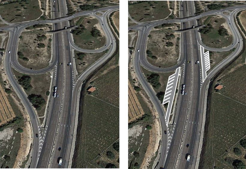 - Marcas viales: el sistema analizado tendía a fallar en configuraciones de entrada y salida de ramales, bifurcaciones y convergencias, es decir, situaciones en las que la actual Instrucción deja un cierto hueco en el marcado vial de borde del carril (García y Camacho-Torregrosa, 2019). De hecho, fruto de esta investigación, la Dirección General de Carreteras del Ministerio de Transportes, en el borrador de la nueva Instrucción de Marcas Viales (8.2-IC, 2020), ha incluido la necesidad de cerrar todos esos huecos dando continuidad a las marcas viales de borde de los carriles (Figura 3).