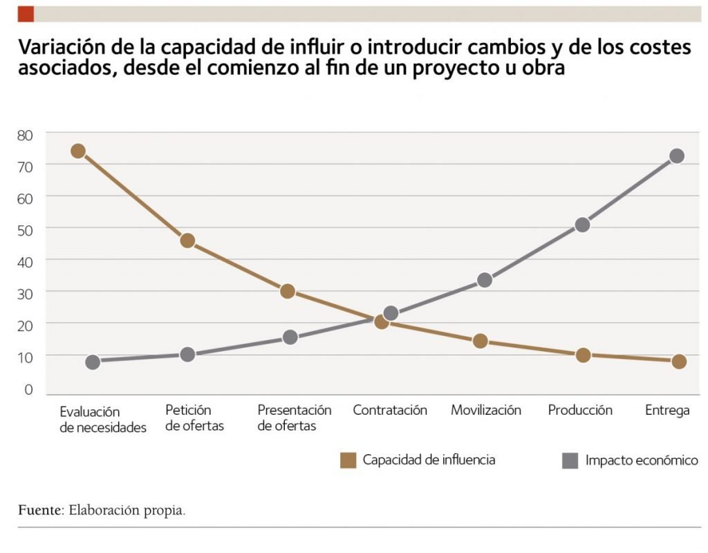 La capacidad de influencia para introducir cambios y los impactos que estos generan varían sustancialmente a lo largo del ciclo de vida de la infraestructura. En la figura de la derecha se representa esquemáticamente la evidencia de que el impacto general de las decisiones o cambios en un proyecto en las primeras etapas es grande, pero en los costos es pequeño; sin embargo, a medida que avanza el proyecto o la obra, la posibilidad de introducir cambios de cualquier tipo se reduce y los impactos económicos asociados aumentan.