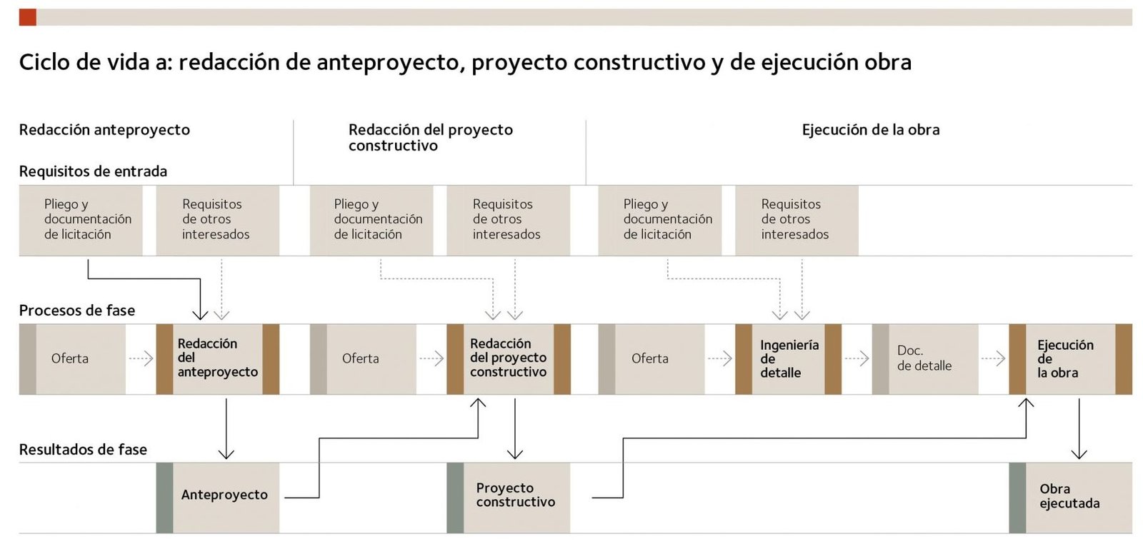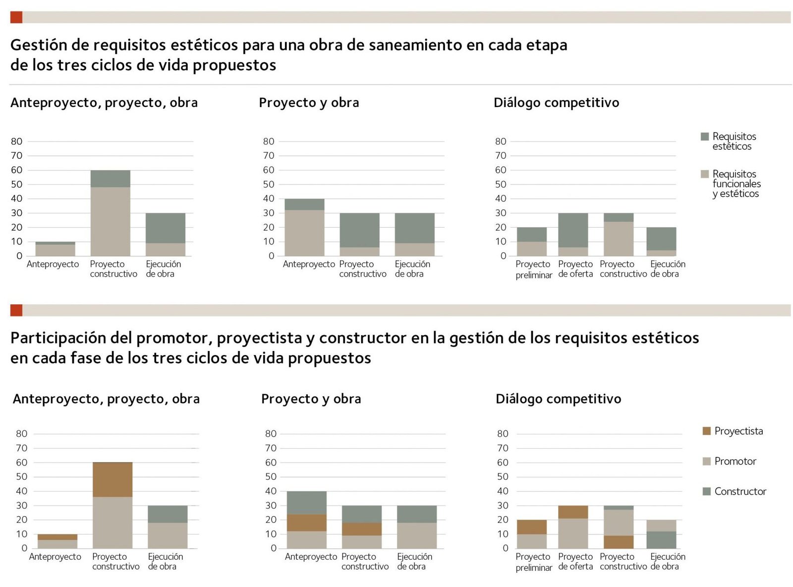 En el caso de una obra organizada mediante el ciclo de vida (a) se aprecia cómo la mayor parte de los requisitos se gestionan en el proyecto constructivo y algunos, en la obra. Muy pocos se determinan en el anteproyecto, puesto que en obras de saneamiento esta fase está orientada a la solución funcional, con escasas implicaciones estéticas en la determinación del alcance y del coste.