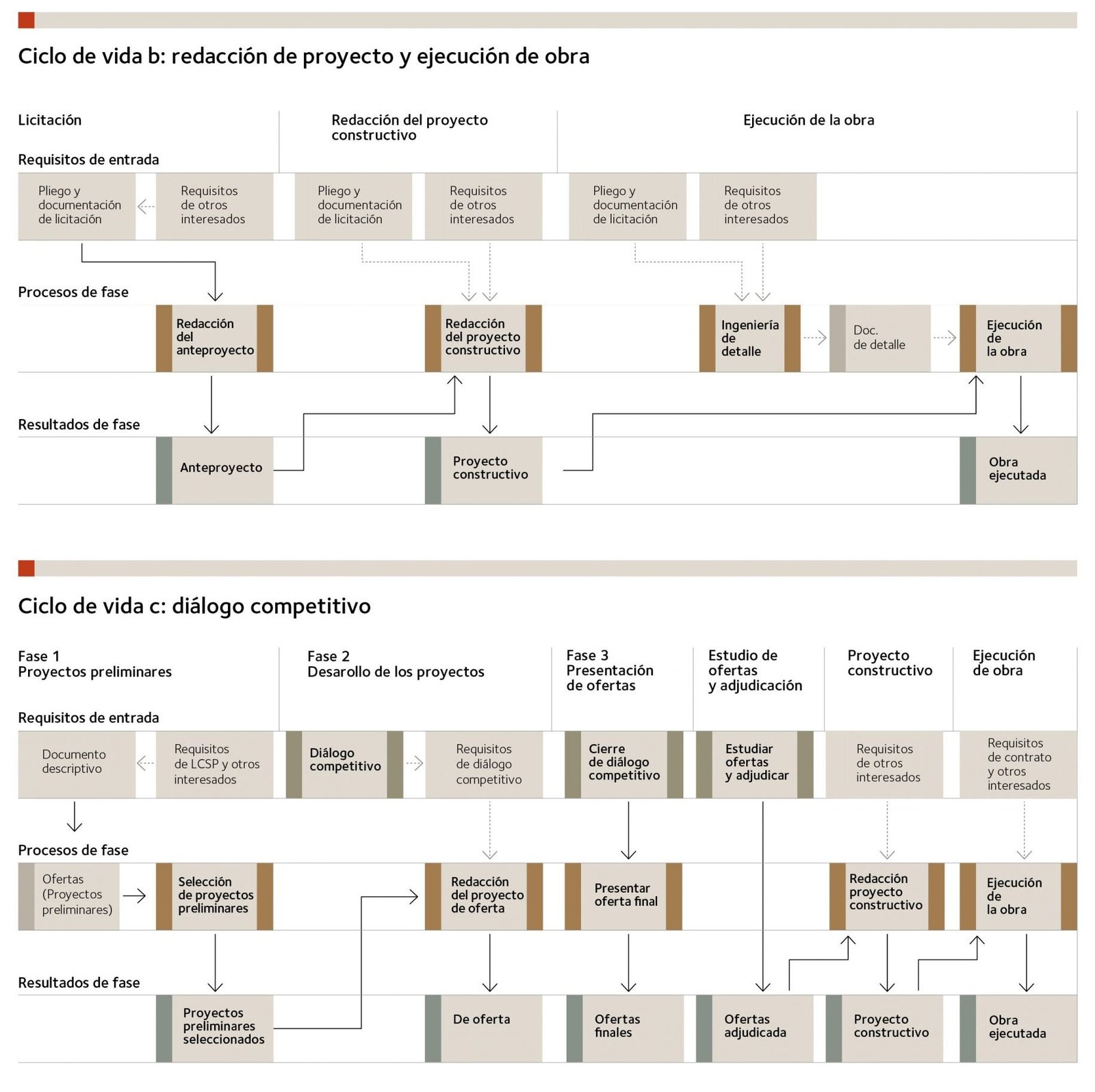 En las tres figuras que se muestran a continuación se esquematizan los procesos y resultados de tres tipos de ciclo de vida. En el primero, el diseño se realiza en dos etapas, con dos contratos y sendos proyectistas, y luego se licita un contrato para la ejecución de la obra. En el segundo, el diseño y la construcción se gestionan mediante un único contrato (“concurso de proyecto y obra”) y en el tercero, también con un único contrato, pero mediante un diálogo competitivo, que es una modalidad de contratación novedosa que incorpora la Ley 9/2017, de 8 de noviembre, de Contratos del Sector Público (LCSP).