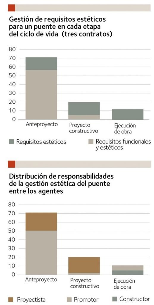 Se aprecian varios cambios importantes respecto a una obra de saneamiento. En primer lugar, la mayor parte de los requisitos estéticos del puente se determinan en el anteproyecto y provienen directamente de la funcionalidad. No obstante, en la primera fase (redacción del anteproyecto) resulta especialmente relevante el papel del promotor, que luego es casi inapreciable en la redacción del proyecto constructivo, una vez decididos los principales requisitos. También se aprecia que, en este tipo de obras, las correcciones o mejoras estéticas durante la construcción son mucho más limitadas que en las de saneamiento por las razones ya apuntadas.