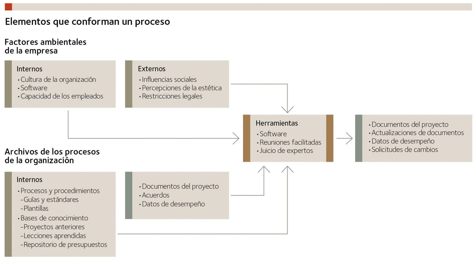 En la selección de los procesos y, sobre todo, en la información de entrada es donde se juega o, al menos, se asegura el nivel de la calidad general y de los valores estéticos de nuestra obra. Por lo indicado en los anteriores apartados, parece claro que se debe contar con procesos de gestión de interesados y de requisitos, además de los asociados a la producción técnica. En cuanto a la información de entrada, el PMBOK determina la necesidad de incorporar a cualquier proceso lo que denomina factores ambientales de la empresa (FAE) y los activos de los procesos de la organización (APO).