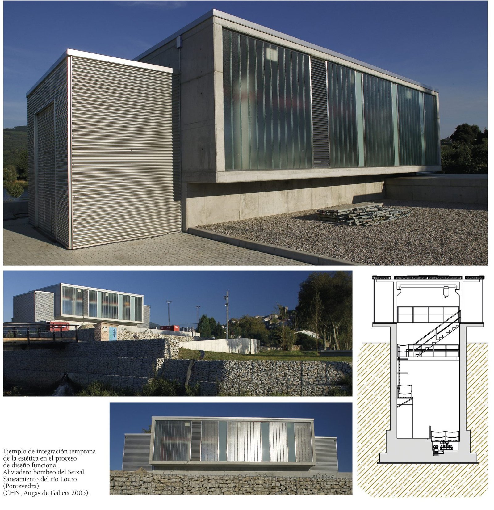 En la página izquierda se muestra cómo la edificación de la estación de bombeo utiliza la infraestructura enterrada como elemento de cimentación de la que cuelga el edificio, lo que genera un efecto estético interesante y una economía en las cimentaciones. Este es un ejemplo donde la arquitectura no es un mero maquillaje, sino que es partícipe y cómplice de la solución funcional, lo que solo es posible con la incorporación temprana del diseño estético al desarrollo funcional.