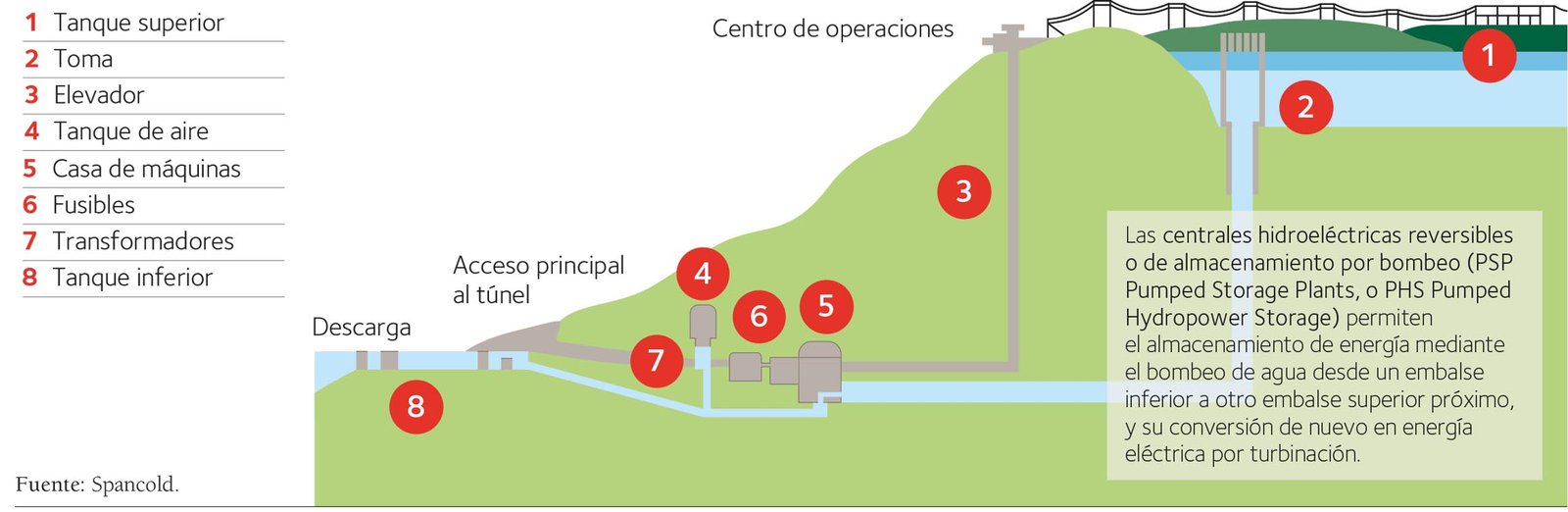 Almacenamiento hidráulico de energía. Esquema central hidroeléctrica reversible