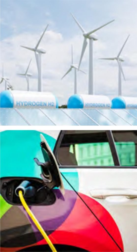 De arriba a abajo, hidrógeno verde producido con energías renovables. Un coche eléctrico, en plena recarga.