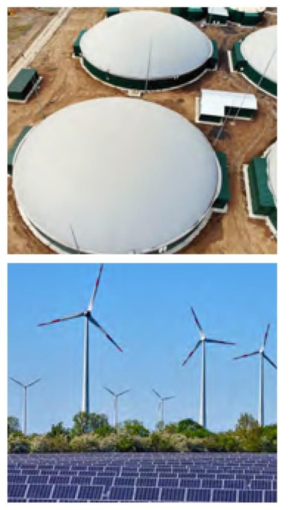 De arriba a abajo, Planta de biogás renovable. Aerogeneradores y placas solares, compartiendo espacio.
