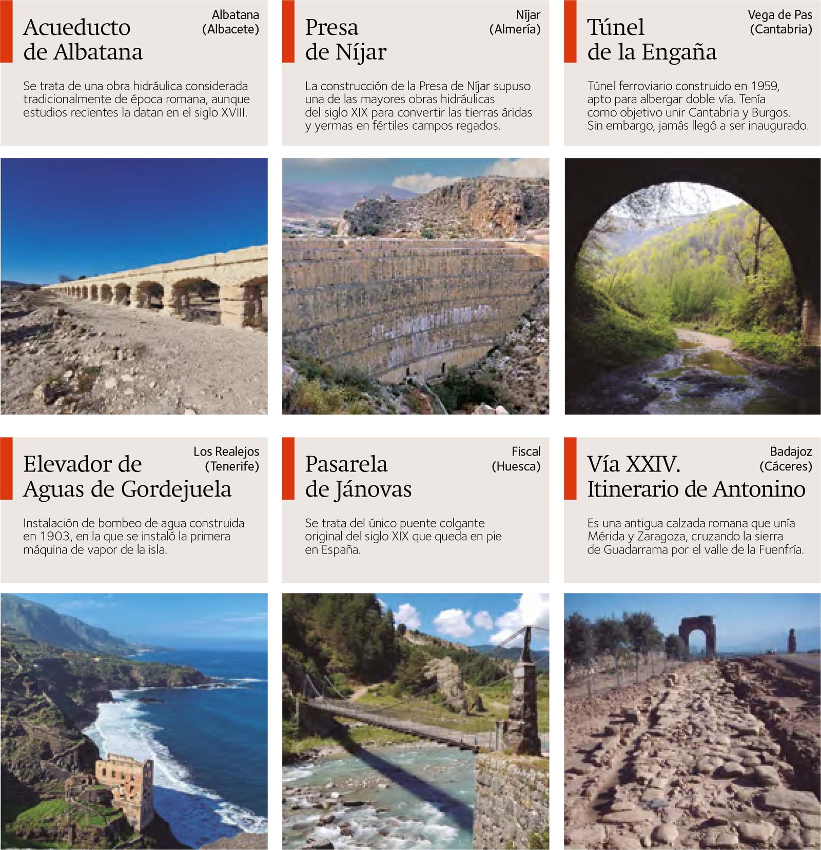 Cada una de las obras recogidas en el catálogo están acompañadas de fotografías del estado actual y, en ocasiones, de planos o imágenes históricas. Además, cuentan con una ficha explicativa donde aparece la ubicación y el acceso, el estado actual de la obra, el uso actual, el histórico y la titularidad. En cada obra un texto sobre su historia aparece y propuestas de actuación. El catálogo se ha realizado con las aportaciones de cada una de las 18 demarcaciones que integran el Colegio y la colaboración del MITMA.