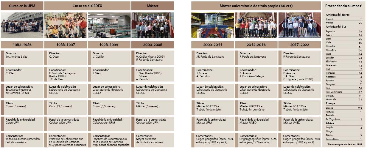 El verdadero germen del máster data de 1965. Fue el denominado Curso de Especialización en Transporte y Mecánica de Suelos para Ingenieros Latinoamericanos, realizado en el Laboratorio de Transporte y Mecánica de Suelos del CEDEX (el actual Laboratorio de Geotecnia), con la colaboración del Instituto de Cultura Hispánica y la Escuela de Ingenieros de Caminos, Canales y Puertos, en Madrid. Partiendo de aquella experiencia, en el año 1982 el profesor D. José Antonio Jiménez Salas, auténtico pionero de la geotecnia en España, concibió y fundó el Curso Internacional de Mecánica del Suelo e Ingeniería de Cimentaciones, orientado fundamentalmente a postgraduados iberoamericanos para contribuir a la promoción del desarrollo técnico en aquellos países. En el combo de abajo se muestra la 6.ª edición en 1986. Téngase en cuenta que pocos años antes (entre 1975 y 1980) la editorial Rueda acababa de publicar, coordinados por el profesor, todos los tomos del libro Geotecnia y cimientos, una obra casi enciclopédica escrita por un nutrido grupo de ingenieros más jóvenes discípulos suyos, que siguieron su estela y formaron parte del cuadro inicial de profesores del curso.