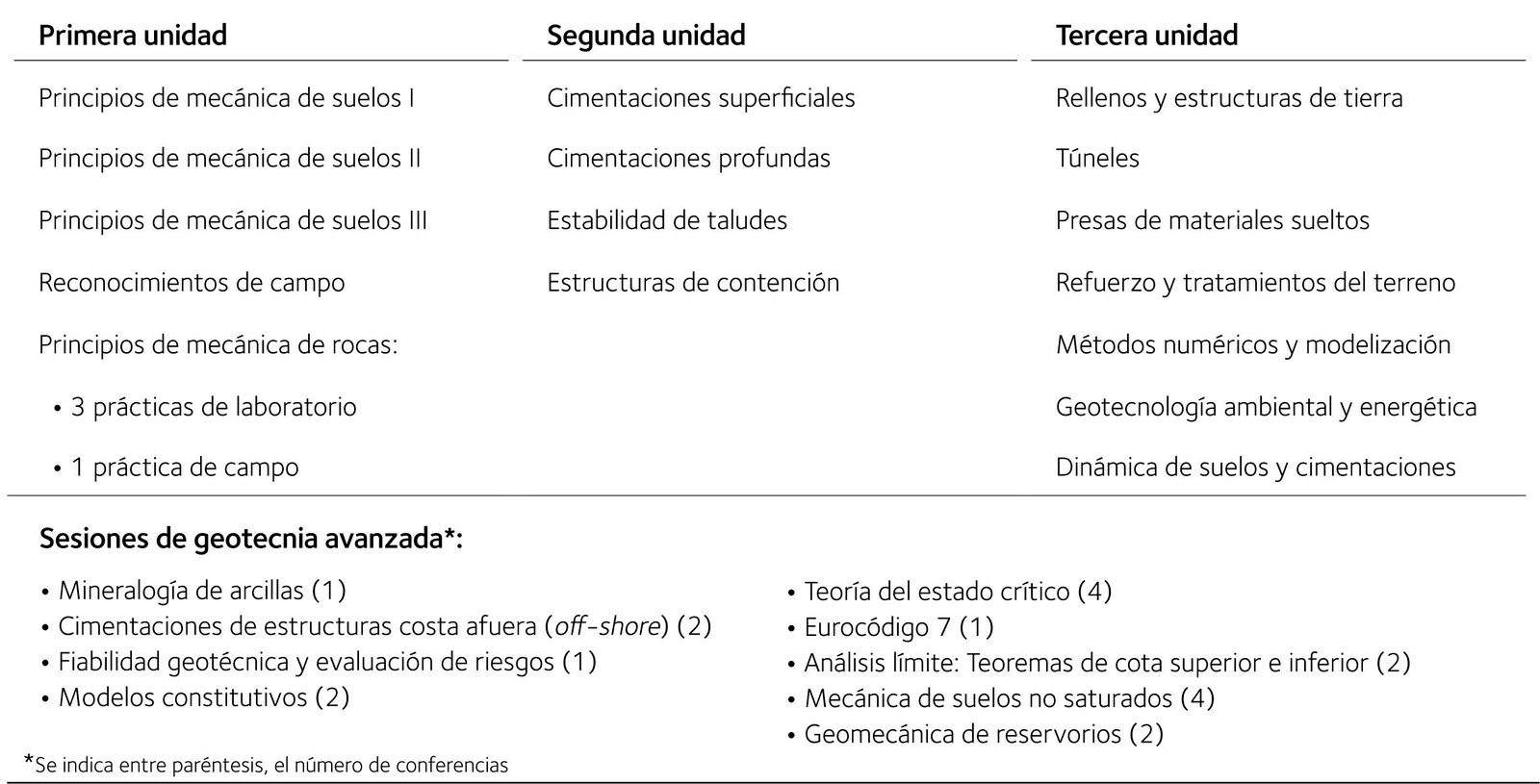 El contenido temático se divide en tres unidades, cada una subdividida en módulos, generalmente de una semana de duración. Todo ello se completa con sesiones sobre Geotecnia avanzada (Ver tabla inferior).