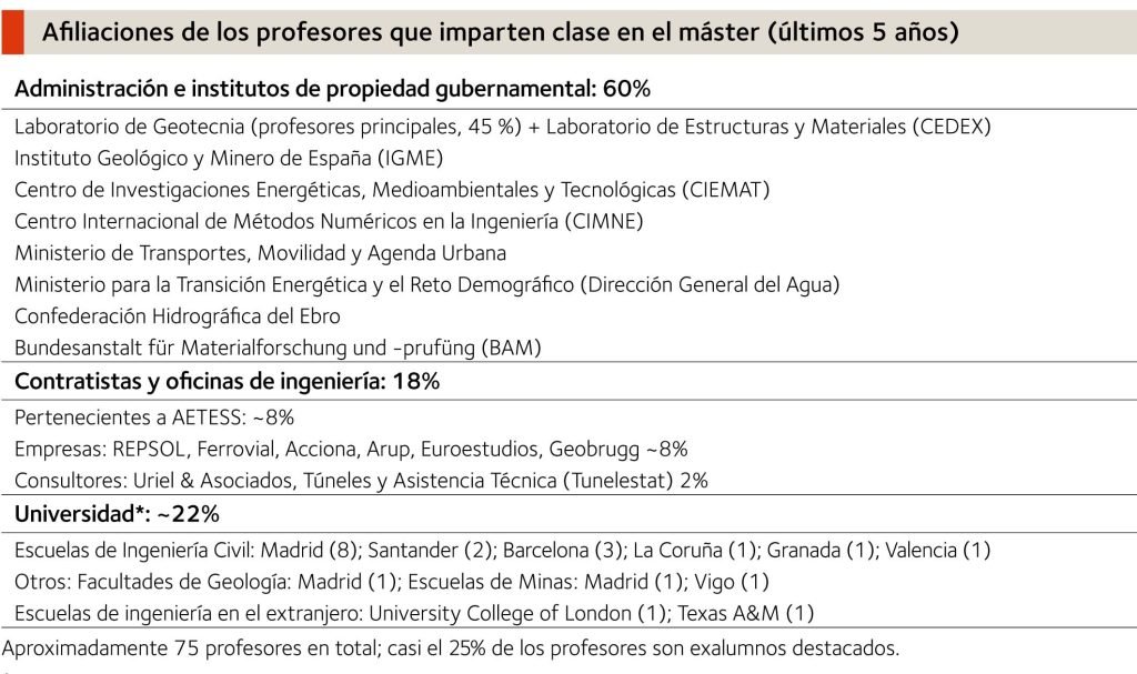 Algunos de los temas relacionados con equipos y trabajos geotécnicos especiales son comúnmente abordados por expertos de la Asociación de Empresas de la Tecnología del Suelo y del Subsuelo (AETESS), que añaden su experiencia profesional a los conceptos teóricos. Por otra parte, muchos profesores se ofrecen también como tutores o miembros de los tribunales que evalúan los trabajos de fin de máster.