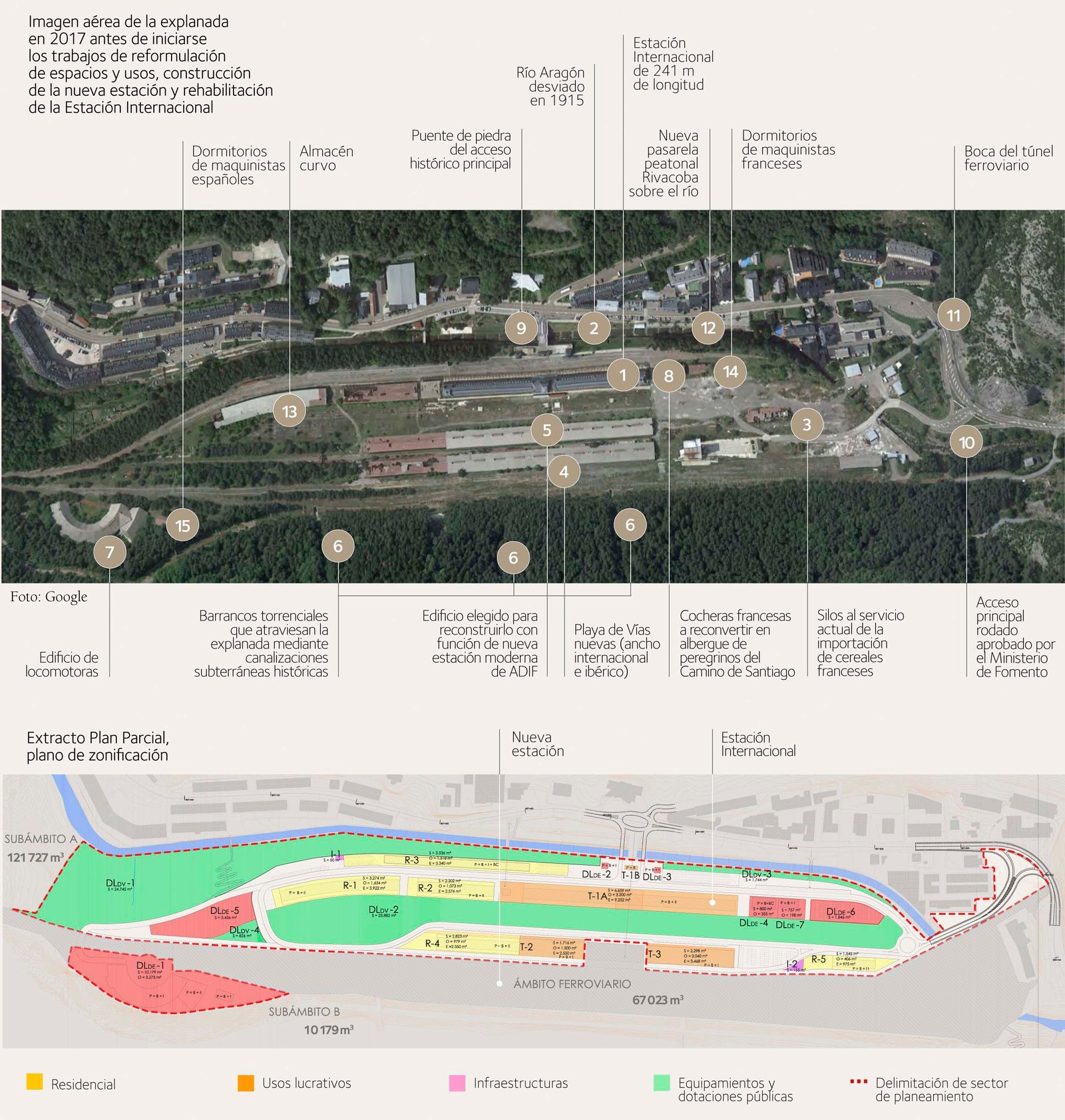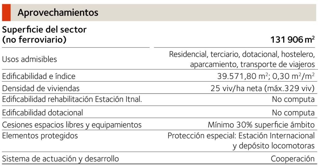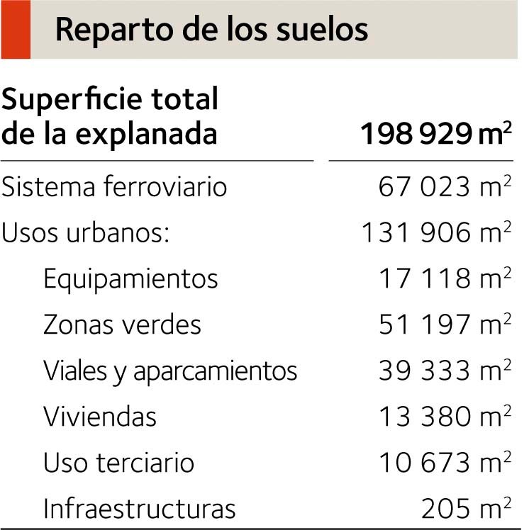 Este Plan Parcial distribuye el espacio y los usos en un bloque «ferroviario», de unos 67 000 m2, y un bloque «urbano», de unos 132 000 m2. En el bloque ferroviario convergen las dos líneas (la española, de ancho ibérico, y la futura francesa de ancho internacional) y la nueva estación de ADIF, moderna y funcional. El bloque urbano se destina a usos de vivienda y terciario, espacios verdes y equipamientos, estos últimos, en general, aprovechando edificios de especial singularidad o protección.