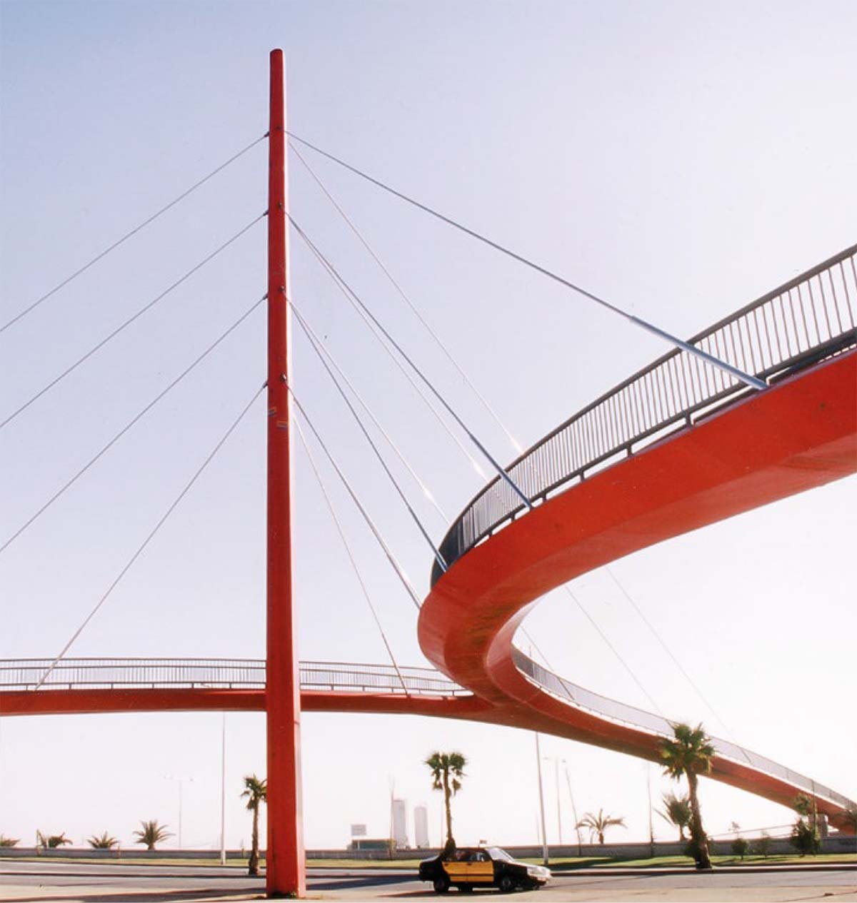 Fue una obra con mucho significado. Obtuvo el premio de Sercometal, los fabricantes de metal. En este caso, de la planta en Y podemos decir que es por las condiciones de funcionamiento de la pasarela. Es decir, había que conectar tres puntos y estaban en una disposición que requerían esa forma. Y en ese caso la condición del lugar fue fundamental para darle forma y colgar desde una sola torre los tres planos de tirantes.