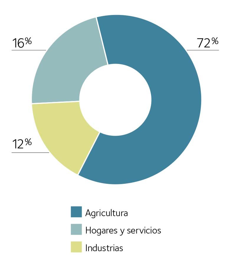 - El 72% de todas las extracciones de agua se destina a la agricultura; el 16%, a los municipios, para hogares y servicios; y el 12%, a las industrias. (ONU-Agua, 2021).
