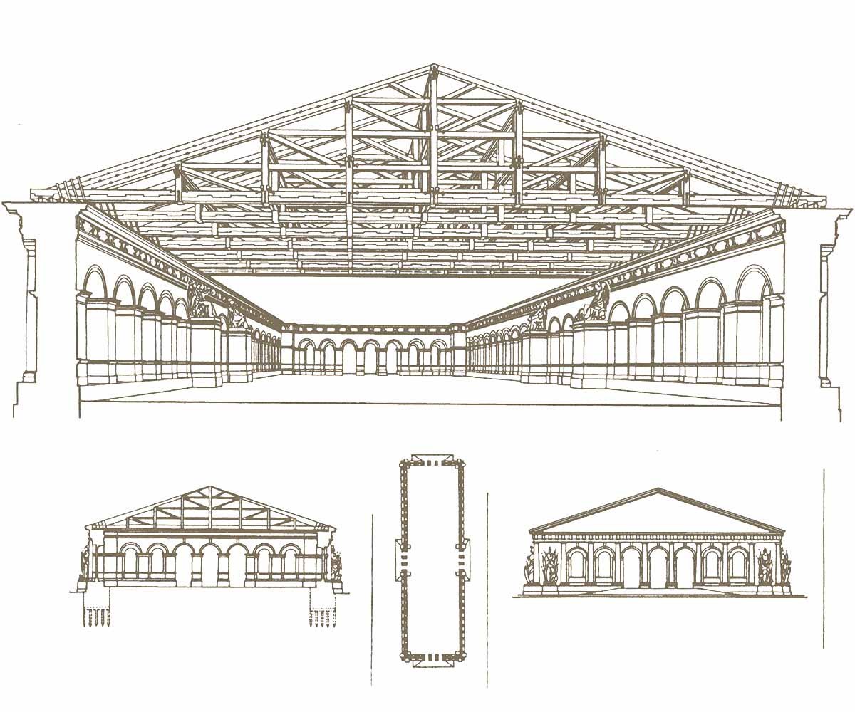 Vistas y perspectiva de la estructura de madera de la cubierta de la Sala Ecuestre de Moscú