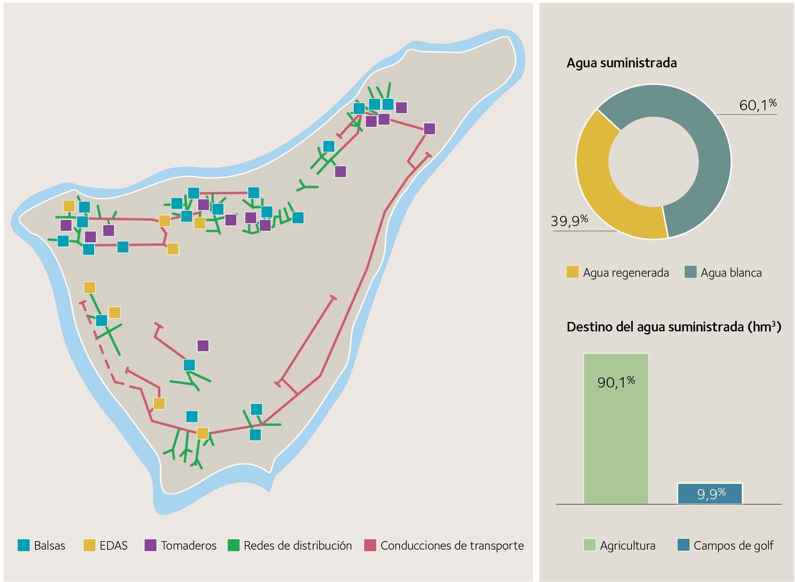 Actualmente, la infraestructura BALTEN la compone un total de 21 balsas de riego, con una capacidad total de almacenamiento de más de 5,1 hm³; tres desaladoras con tecnología EDR (electrodiálisis reversible), dos de agua depurada y una de agua salobre; 1500 kilómetros de conducciones y tuberías de transporte y distribución; tres pozos; una galería de agua subterránea; y más de 11 500 abonados para el suministro de agua de riego en Tenerife. Es de destacar la importante dispersión de los más de 11 500 puntos de suministro gestionados por BALTEN y su distribución, concentrada entre la costa y la cota 600 m s. n. m.