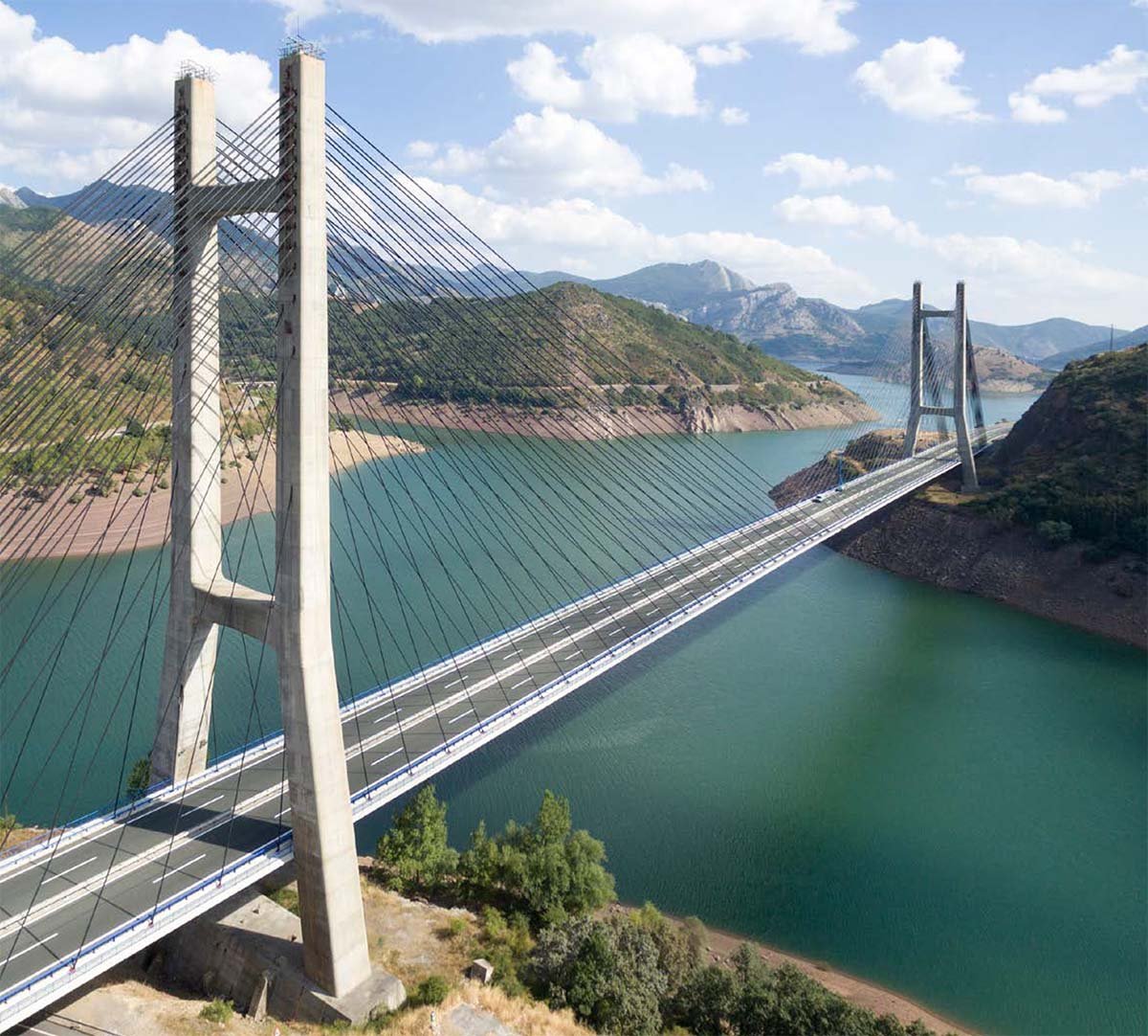 La obra principal de esta autopista, y en mi opinión el puente fundamental de todos los que hizo Javier Manterola a lo largo de su vida profesional, que fueron muchos, es el del pantano de Barrios de Luna. Es un proyecto en el que se empleó a fondo, porque la solución que adoptó fue un paso de gigante en los puentes atirantados, tanto en los españoles como en los de todo el mundo. No fue una solución que se adoptara de origen en este caso, sino que fue el resultado de un largo y elaborado estudio de una serie de soluciones con pilas en el pantano que se fueron eliminando por diversos motivos. El definitivo fue que era inviable cimentar en el fondo del pantano con su profundidad de agua posible y por la dificultad del terreno, porque el pantano de Barrios de Luna no admitía ningún tipo de regulación de la cota de agua debida a la construcción del puente. Por ello, la luz de 440 m resultó obligada dadas las dificultades que planteaba el terreno de cimentación de una de las torres incluso sin agua.