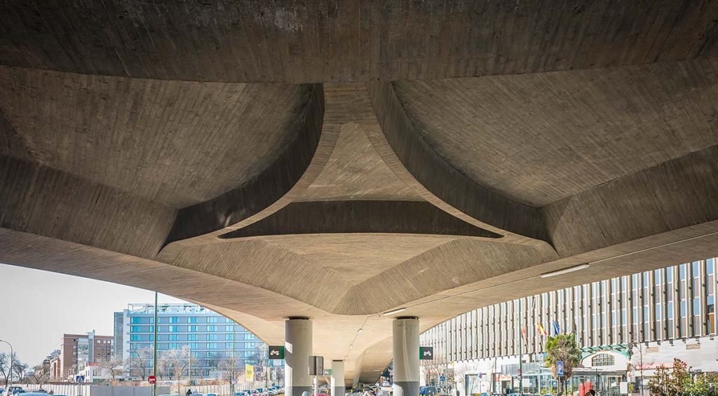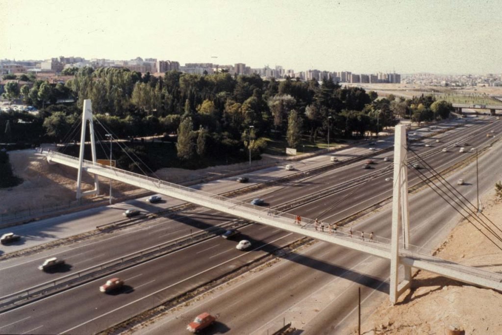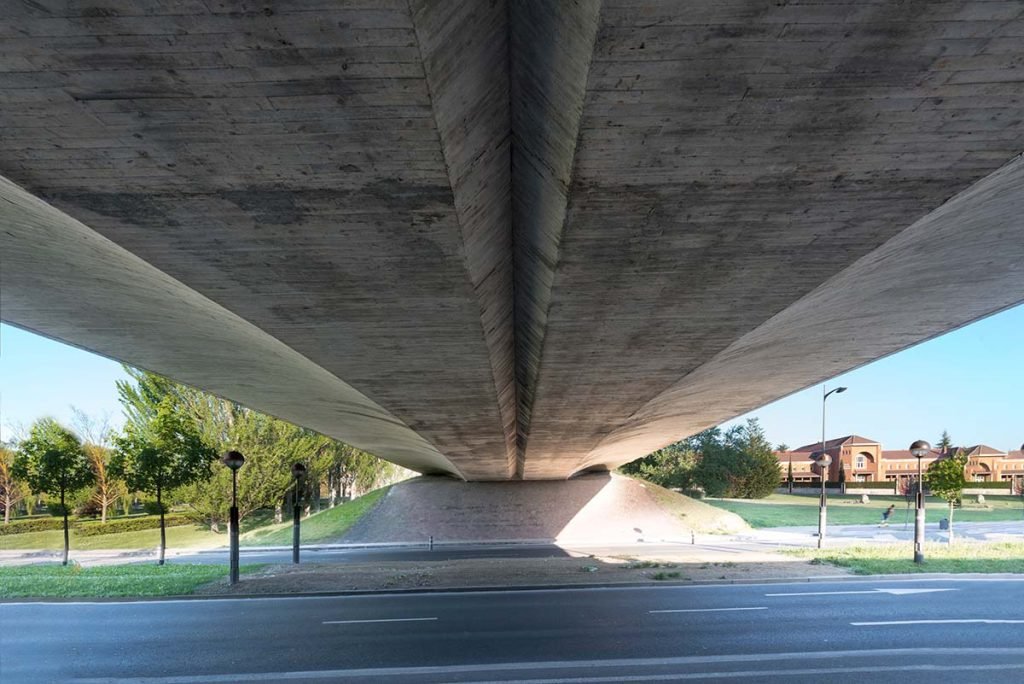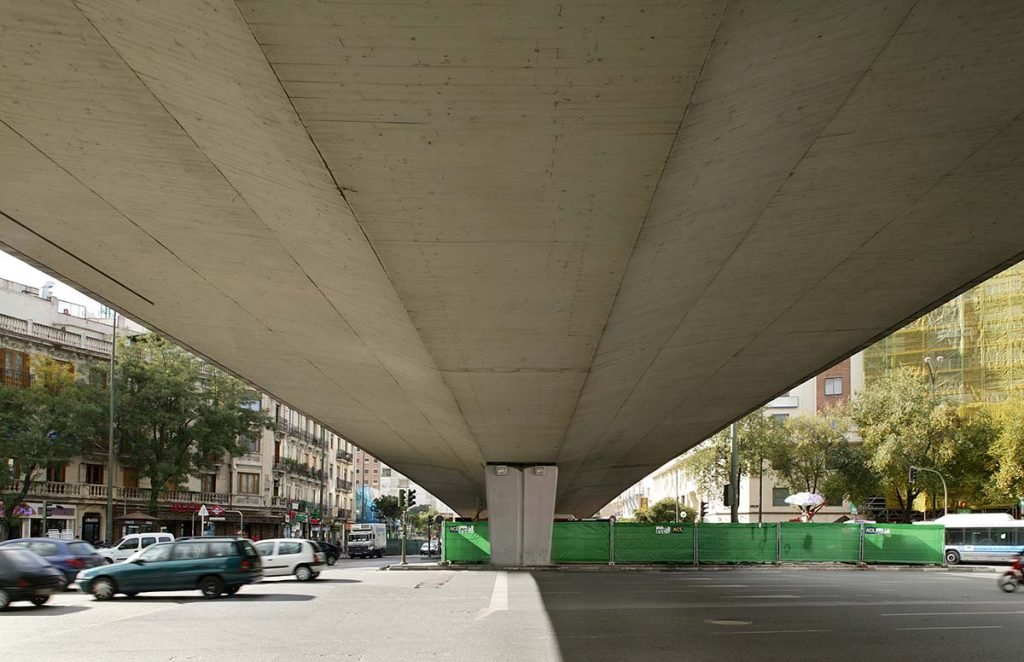 En 1969 salió a concurso del Ayun-tamiento de Madrid el paso sobre la plaza de Cuatro Caminos. Presentamos varias soluciones y ganó la de Javier Manterola, que fue la que desarrolló y construyó: un paso de siete vanos de canto constante con luces de 34 m. Fue una solución innovadora que tuvo trascendencia en la morfología de los viaductos urbanos posteriores porque, si bien este tipo de obras se resolvían transversalmente con vigas principales en cajón y voladizos laterales, en Cuatro Caminos hizo una sección unitaria que, partiendo de un núcleo principal iba disminuyendo transversalmente hasta el borde. La disminución gradual de la sección transversal se logró mediante una poligonal y no con una curva continua, como hizo después en otras secciones análogas, pero creo que la poligonal destaca en este caso la forma de la sección transversal. El paso de Cuatro Caminos es un hito importante en la trayectoria profesional de Javier Manterola.