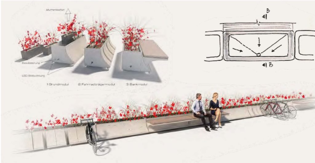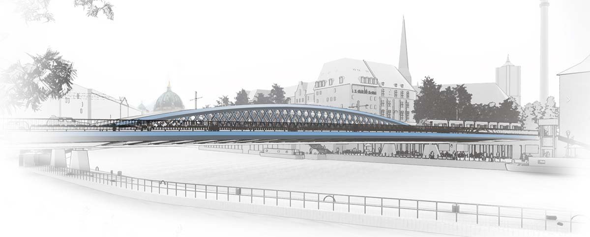 Croquis de trabajo e imagen digital posterior. Diseño de elementos urbanos para un puente en Berlín