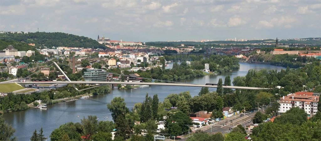Croquis e infografía digital del puente colgante Dvorecký, Praga (República Checa)