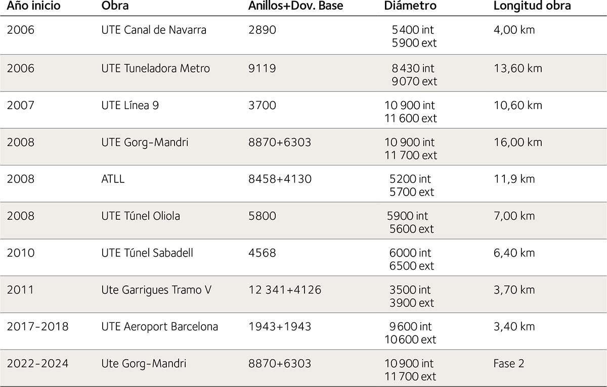 Principales obras de fabricación de revestimiento de túneles en las que Sorigué ha participado