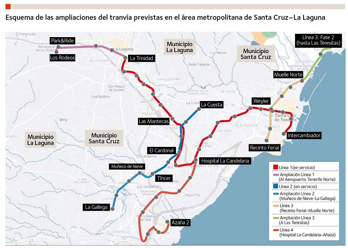 - Tranvías. A corto plazo se trabaja para la implantación de una nueva parada en la Línea 2, alargando unos 600 metros más de trazado, por la próxima expansión de la zona suroeste de Santa Cruz. También se quiere dar continuidad a la Línea 1 para conectarla con el aeropuerto Tenerife Norte Ciudad de la Laguna‑Los Rodeos, que el año pasado movió más de 6 millones de viajeros. Además, están en proyecto dos nuevas líneas, la 3, que cruzaría todo el centro de la capital santacrucera, y la 4, que discurriría por la zona suroeste de esa misma ciudad.