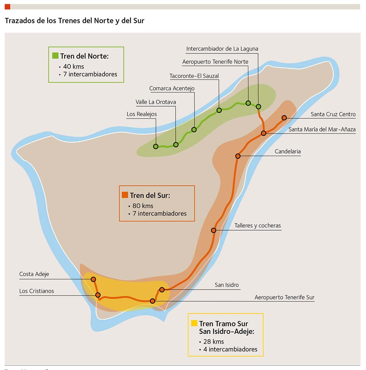 - Trenes. Además del Tren del Norte, Metrotenerife apuesta por el Tren del Sur, un corredor con trenes de cercanías de altas prestaciones desde Santa Cruz hasta Adeje, en el sur de la isla, con el objetivo de conectar ambos mercados de empleo, servicios y turismo. Tendría 80 kilómetros de trazado, de los que 22,1 serían túneles y falsos túneles, y habría 7 intercambiadores.