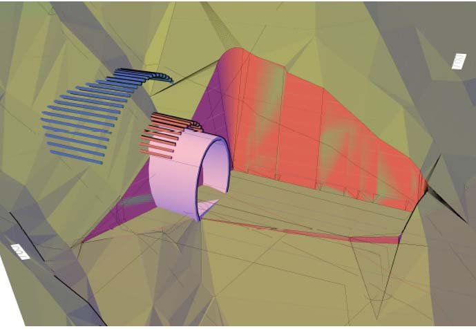 Esta filosofía de «anticipación» en la toma de decisiones se ejemplificó de manera notable en la galería de emergencia del túnel de Pamplona. Esta galería, paralela al eje del túnel principal, tuvo su frente de excavación por delante del principal durante la mayor parte de su construcción (véase figura 8). En consecuencia, y como la galería se excavó en el mismo material que el túnel principal, las condiciones del terreno y los condicionantes encontrados en la galería durante su excavación permitieron anticiparse en la toma de decisiones durante la excavación del túnel principal, donde se dieron los mismos condicionantes (puntajes RMR, tipo de sostenimiento instalado, convergencias, etc.).