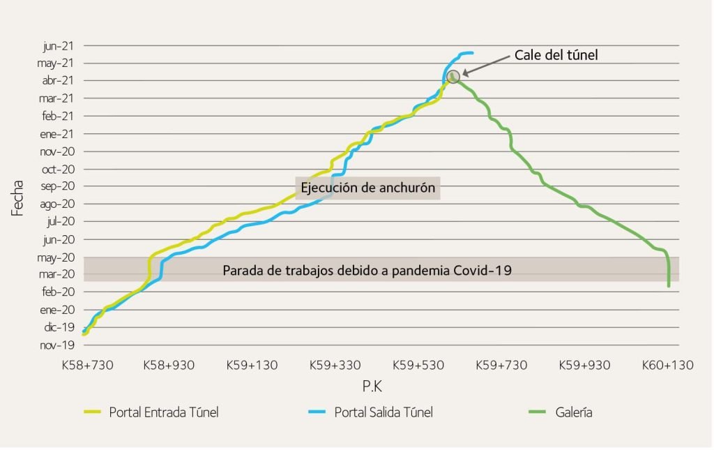Vinculado a este último concepto, se realizó también un seguimiento de los rendimientos globales de la excavación en todos los túneles. Las paradas inevitables durante la construcción (pandemia de coronavirus) o la priorización de otras labores (ejecución del anchurón entre el túnel principal y la galería de emergencia) hicieron que estos rendimientos disminuyesen algunos meses.