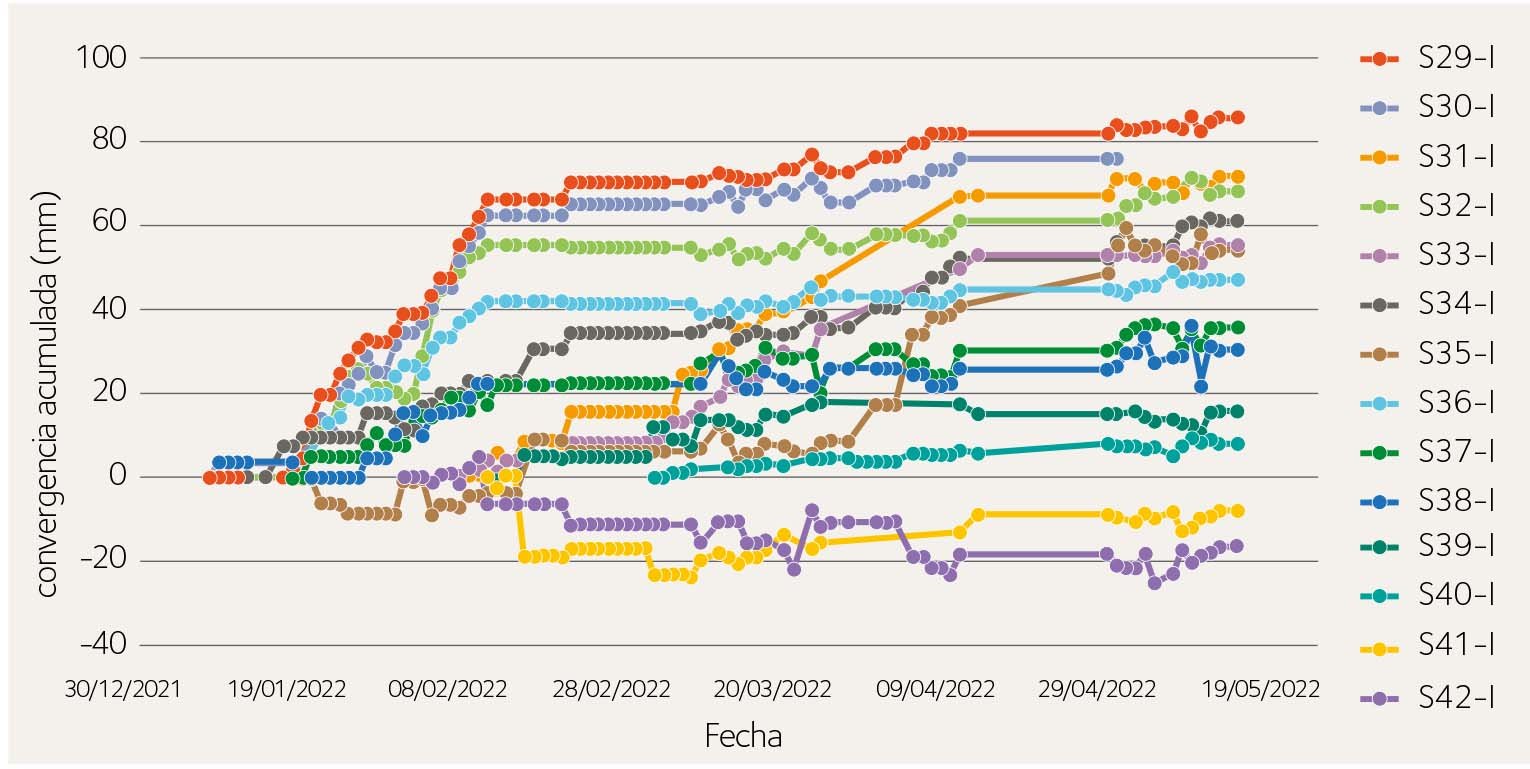 Por lo general, la distancia entre estaciones de convergencia instaladas fue de 10 metros, siendo la distancia en zonas más susceptibles de deformación de 5 metros.