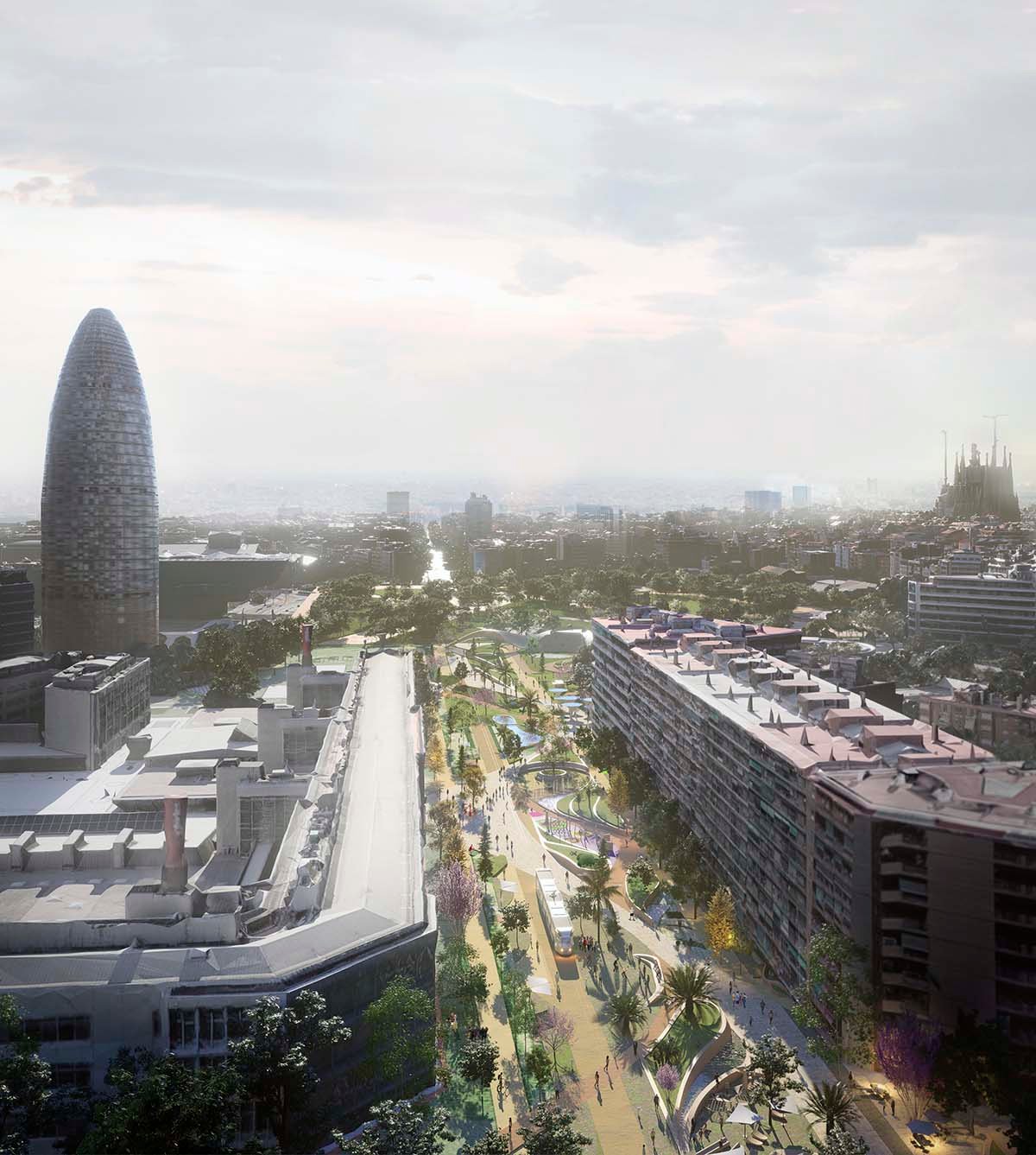 Otro ejemplo, esta vez a nivel urbano, fue nuestra propuesta para peatonalizar la Gran Vía de Barcelona en su conexión con la plaza de Glorias, donde nuestra aproximación al proyecto fue, de nuevo, ir más allá de conectar de manera inmediata los puntos A y B. En este caso entendimos la oportunidad de leer la calle como un tránsito y disfrute de la actividad de caminar y no como una vía rápida para el peatón. Concebimos una experiencia sensorial a través de la vegetación propuesta que acompaña al viandante con policromías y aromaterapia de plantas y flores. Además, ese espacio de tránsito se salpica de múltiples espacios de actividades al exterior como calistenia, zonas de exposición, auditorio, zona de restauración y zonas de juegos infantiles.