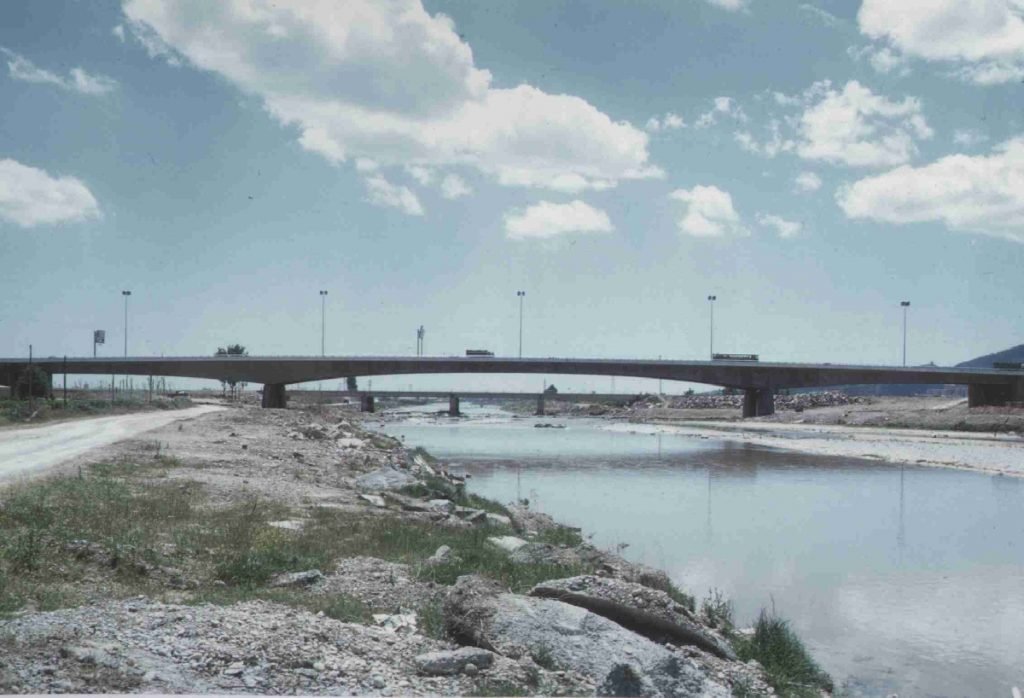 Cerca de la obra anterior, José Antonio diseñó dos pasarelas en arco de hormigón armado de 100 m de luz. Una de ellas todavía perdura y la otra fue demolida hace unos años al remodelarse dicha vía. Con estas obras, José Antonio inauguró otra etapa, adentrándose en el proyecto de arcos, fueran metálicos, mixtos o de hormigón, como es el caso. Y aquí nos mostró su conocimiento y dominio de la técnica, en particular en lo que se refiere a la evaluación del efecto de la reología en arcos de hormigón, en cómo tenerlo en cuenta y, sobre todo, en cómo resolver sus consecuencias de una forma ingenieril, es decir, eficiente y realizable.