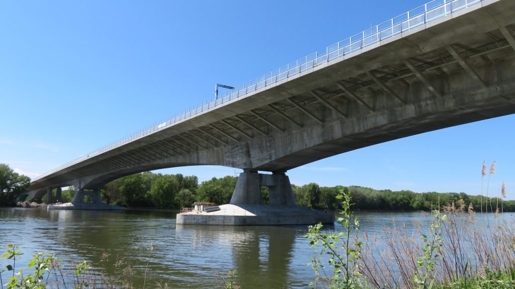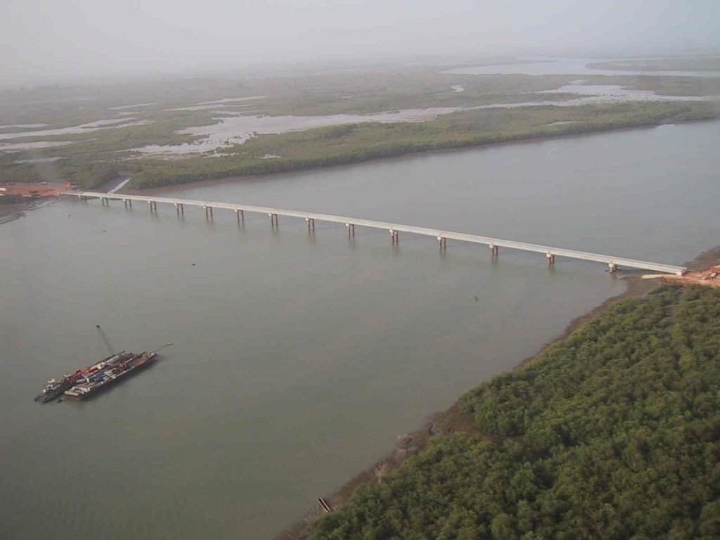 No puedo dejar de referirme a dos puentes construidos en los 2000, a los que José Antonio dedicó tiempo y energías, además de aportar su vasto conocimiento en el proyecto y también durante su construcción. En 1997 empezamos con el proyecto del puente sobre el río Mansoa en Guinea Bissau. Se trata de un puente de 700 m de longitud situado sobre un cauce ciertamente profundo, con gran caudal y afectado de una carrera de marea de cerca de 5 m. Para completar el halagüeño panorama, el terreno de cimentación estaba formado por un terreno limoso de mucha potencia y muy poco competente, por no decir “casi totalmente incompetente”. La solución adoptada fue un puente formado por vanos isostáticos con un tablero con dos vigas artesas de 45 m de luz soportada por dos pilotes de gran diámetro. La verdad es que la elección y definición de la cimentación fue todo un reto que solo pudo ser resuelto por la inestimable participación de ¡dos! Premios Nacionales de Ingeniería: el propio José Antonio Torroja y Alcibíades Serrano, nuestro asesor geotécnico habitual.